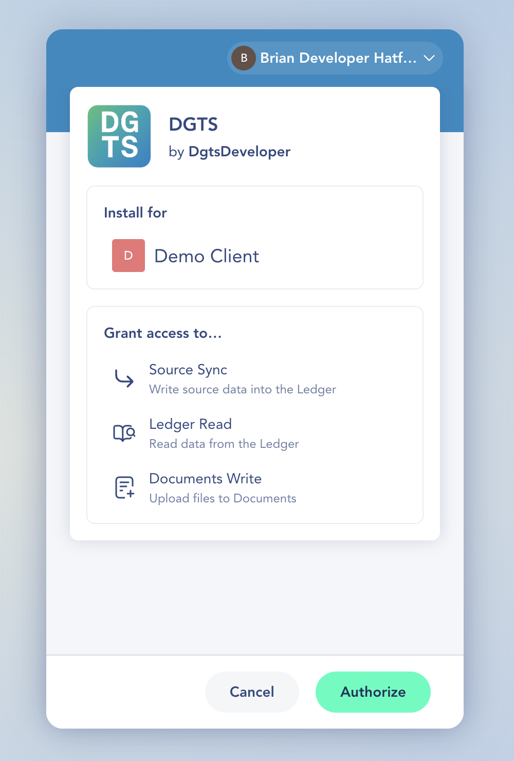 The OAuth authorization flow will automatically select your demo client when invoked with Development keys, enabling you to install your app to your development sandbox.