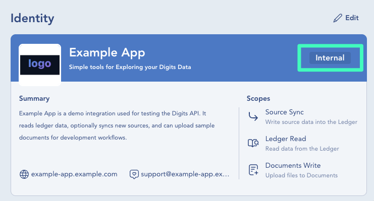 - On the Developer Dashboard, each app card shows an Internal badge.