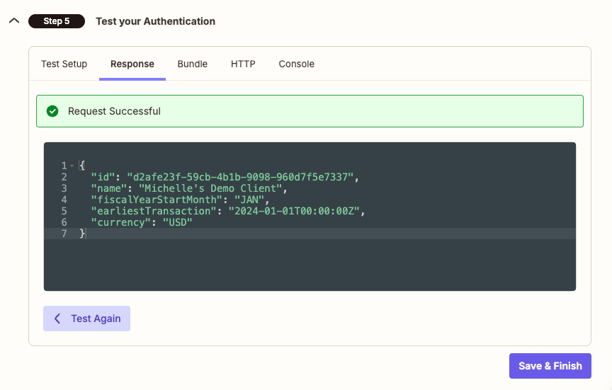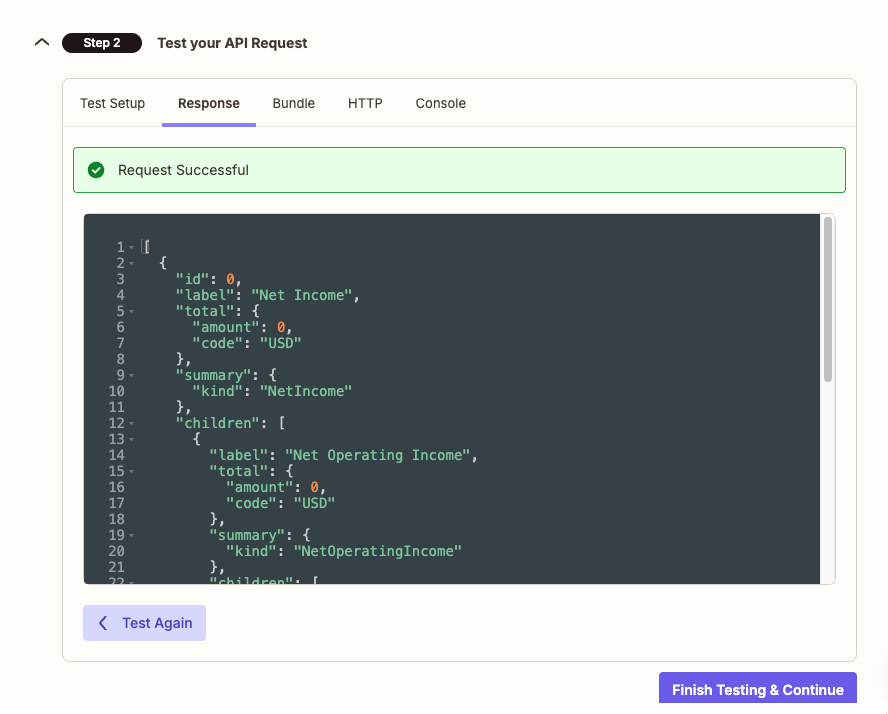 Step 2 — Test your API Request Click Test Your Request. You should see Profit & Loss data returned from your Digits sandbox. If it succeeds, click Finish Testing & Continue.