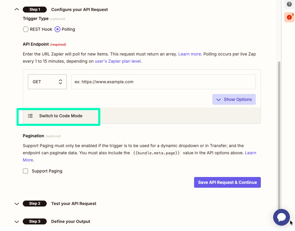 Step 1: Configure your API request Go to the API Configuration tab, click Switch to Code Mode, and confirm the prompt.