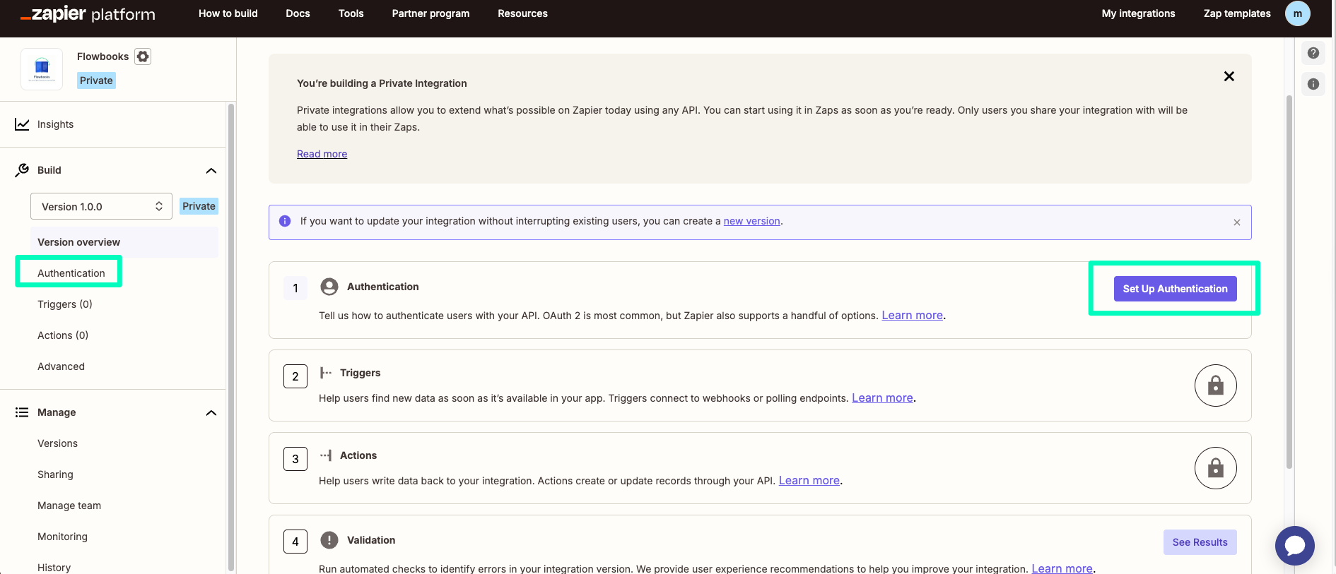 After you click create, you’ll land in Version Overview. Click Authentication in the left menu or Set Up Authentication.